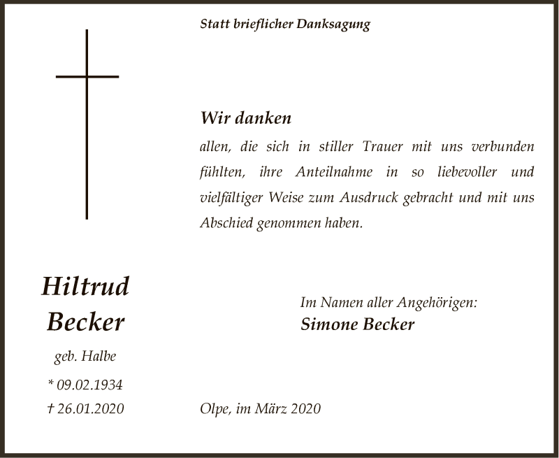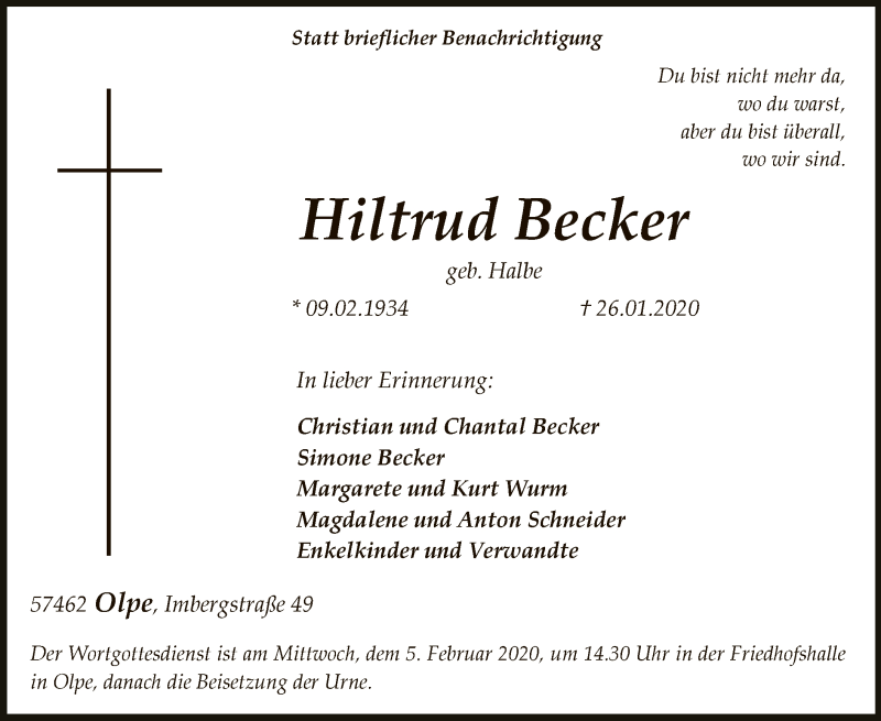 Hier finden Sie alle Traueranzeigen aus der Zeitung, die bisher für Hiltrud Becker erschienen sind. Weitere Traueranzeigen, die in der Zeitung erscheinen, werden hier ebenfalls aufgelistet