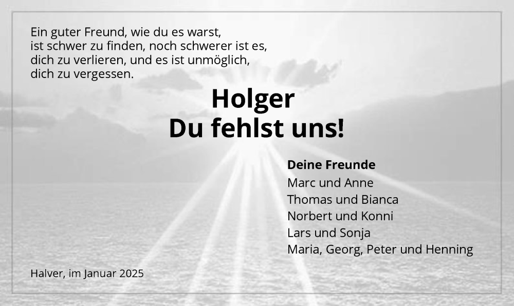 Hier finden Sie alle Traueranzeigen aus der Zeitung, die bisher für Holger erschienen sind. Weitere Traueranzeigen, die in der Zeitung erscheinen, werden hier ebenfalls aufgelistet