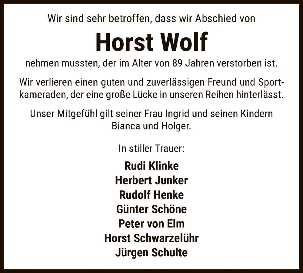 Hier finden Sie alle Traueranzeigen aus der Zeitung, die bisher für Horst Wolf erschienen sind. Weitere Traueranzeigen, die in der Zeitung erscheinen, werden hier ebenfalls aufgelistet