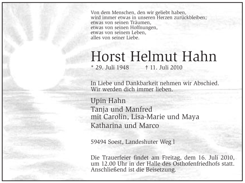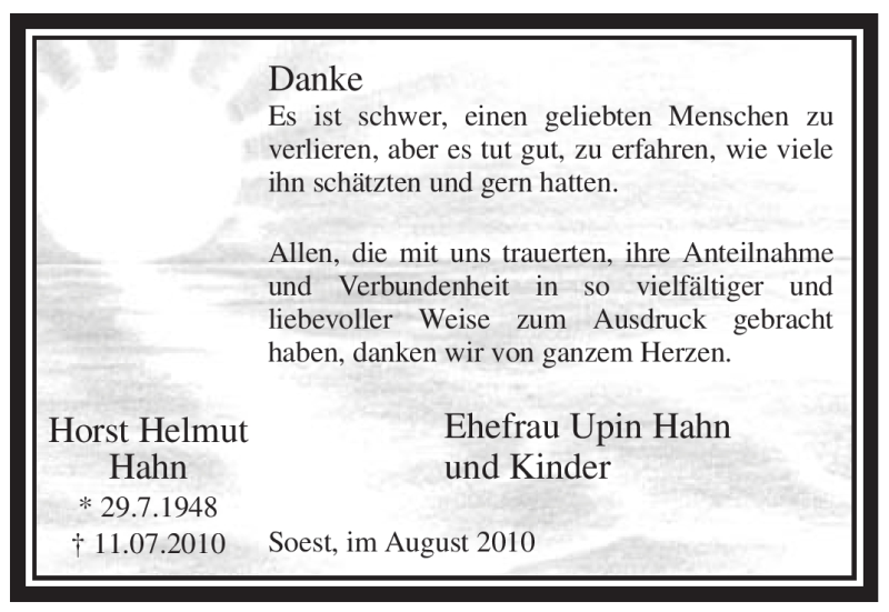Hier finden Sie alle Traueranzeigen aus der Zeitung, die bisher für Horst Helmut Hahn erschienen sind. Weitere Traueranzeigen, die in der Zeitung erscheinen, werden hier ebenfalls aufgelistet