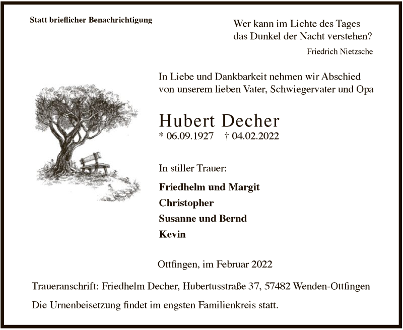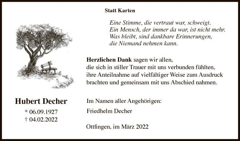 Hier finden Sie alle Traueranzeigen aus der Zeitung, die bisher für Hubert Decher erschienen sind. Weitere Traueranzeigen, die in der Zeitung erscheinen, werden hier ebenfalls aufgelistet