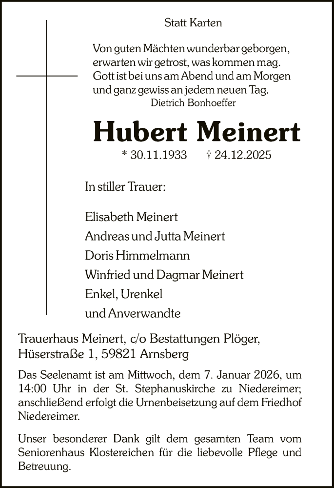 Hier finden Sie alle Traueranzeigen aus der Zeitung, die bisher für Hubert Meinert erschienen sind. Weitere Traueranzeigen, die in der Zeitung erscheinen, werden hier ebenfalls aufgelistet