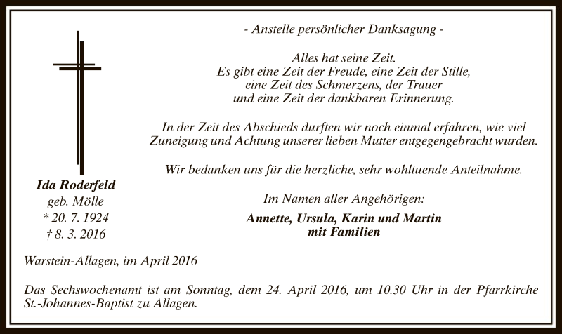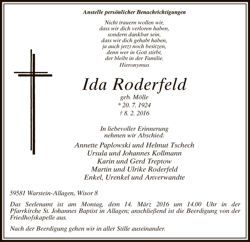 Hier finden Sie alle Traueranzeigen aus der Zeitung, die bisher für Ida Roderfeld erschienen sind. Weitere Traueranzeigen, die in der Zeitung erscheinen, werden hier ebenfalls aufgelistet