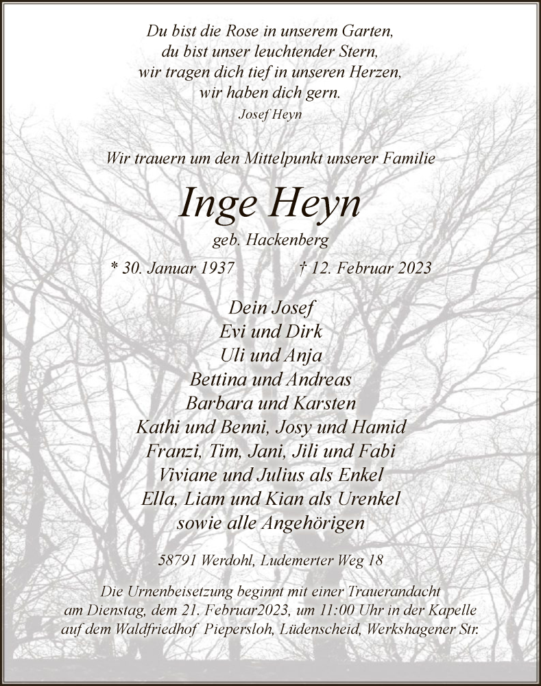 Hier finden Sie alle Traueranzeigen aus der Zeitung, die bisher für Inge Heyn erschienen sind. Weitere Traueranzeigen, die in der Zeitung erscheinen, werden hier ebenfalls aufgelistet