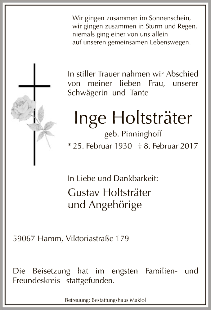 Hier finden Sie alle Traueranzeigen aus der Zeitung, die bisher für Inge Holtsträter erschienen sind. Weitere Traueranzeigen, die in der Zeitung erscheinen, werden hier ebenfalls aufgelistet