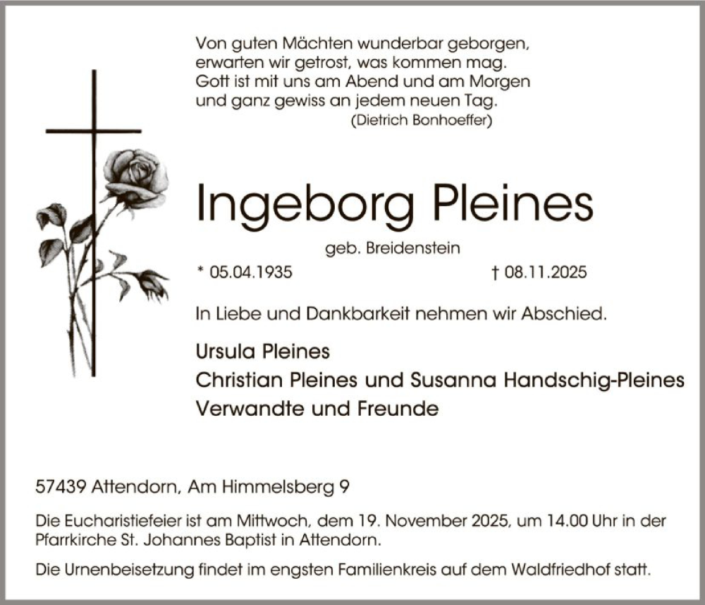 Hier finden Sie alle Traueranzeigen aus der Zeitung, die bisher für Ingeborg Pleines erschienen sind. Weitere Traueranzeigen, die in der Zeitung erscheinen, werden hier ebenfalls aufgelistet