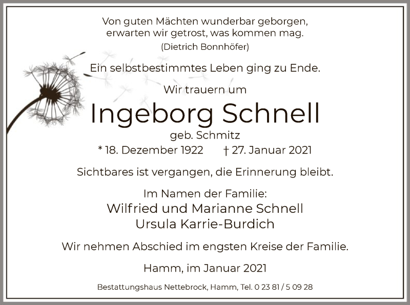 Hier finden Sie alle Traueranzeigen aus der Zeitung, die bisher für Ingeborg Schnell erschienen sind. Weitere Traueranzeigen, die in der Zeitung erscheinen, werden hier ebenfalls aufgelistet
