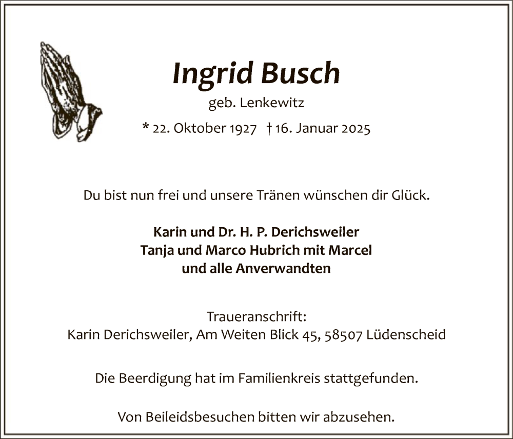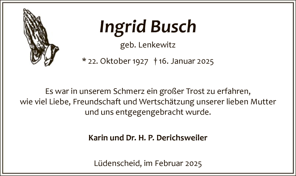 Hier finden Sie alle Traueranzeigen aus der Zeitung, die bisher für Ingrid Busch erschienen sind. Weitere Traueranzeigen, die in der Zeitung erscheinen, werden hier ebenfalls aufgelistet