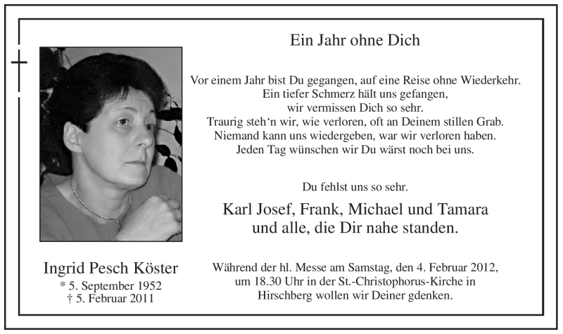 Hier finden Sie alle Traueranzeigen aus der Zeitung, die bisher für Ingrid Pesch Köster erschienen sind. Weitere Traueranzeigen, die in der Zeitung erscheinen, werden hier ebenfalls aufgelistet