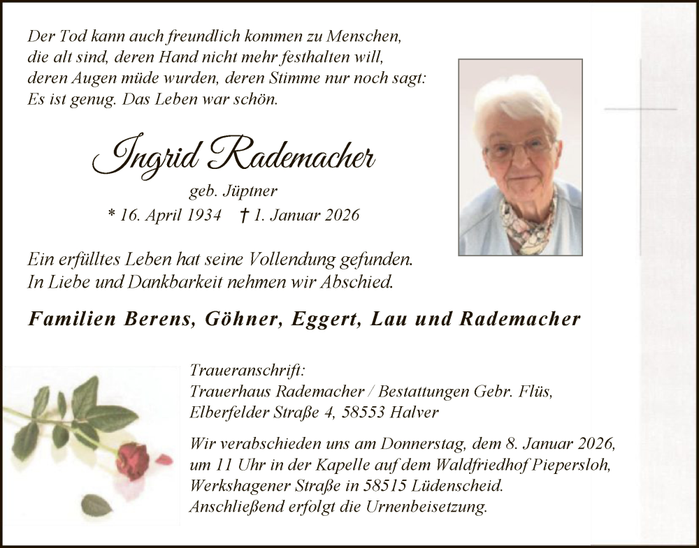 Hier finden Sie alle Traueranzeigen aus der Zeitung, die bisher für Ingrid Rademacher erschienen sind. Weitere Traueranzeigen, die in der Zeitung erscheinen, werden hier ebenfalls aufgelistet