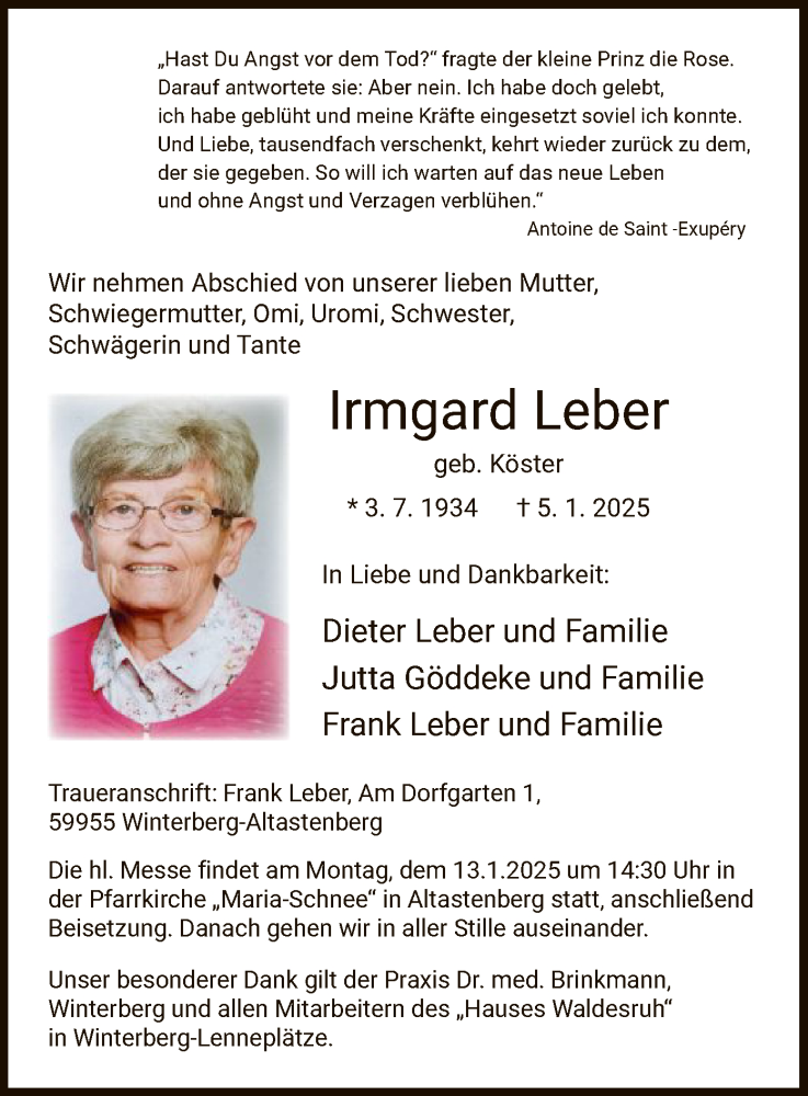 Hier finden Sie alle Traueranzeigen aus der Zeitung, die bisher für Irmgard Leber erschienen sind. Weitere Traueranzeigen, die in der Zeitung erscheinen, werden hier ebenfalls aufgelistet