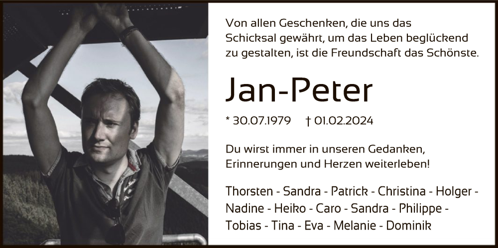 Hier finden Sie alle Traueranzeigen aus der Zeitung, die bisher für Jan-Peter erschienen sind. Weitere Traueranzeigen, die in der Zeitung erscheinen, werden hier ebenfalls aufgelistet
