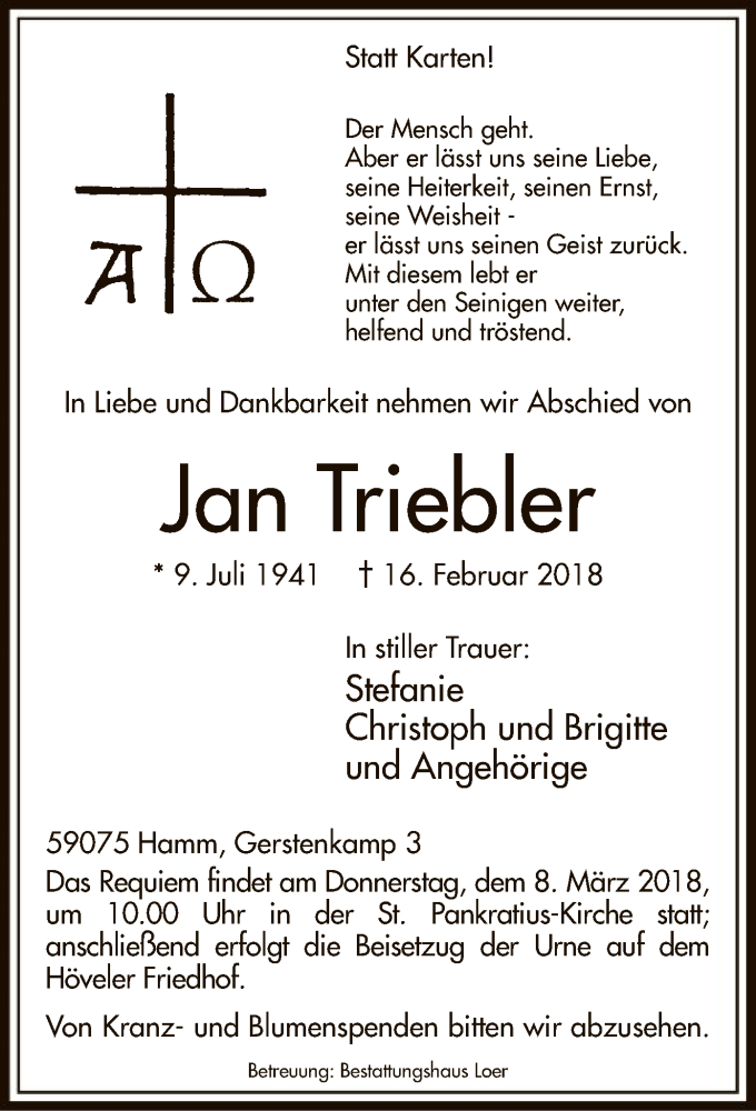 Hier finden Sie alle Traueranzeigen aus der Zeitung, die bisher für Jan Triebler erschienen sind. Weitere Traueranzeigen, die in der Zeitung erscheinen, werden hier ebenfalls aufgelistet