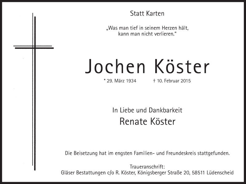 Hier finden Sie alle Traueranzeigen aus der Zeitung, die bisher für Jochen Köster erschienen sind. Weitere Traueranzeigen, die in der Zeitung erscheinen, werden hier ebenfalls aufgelistet