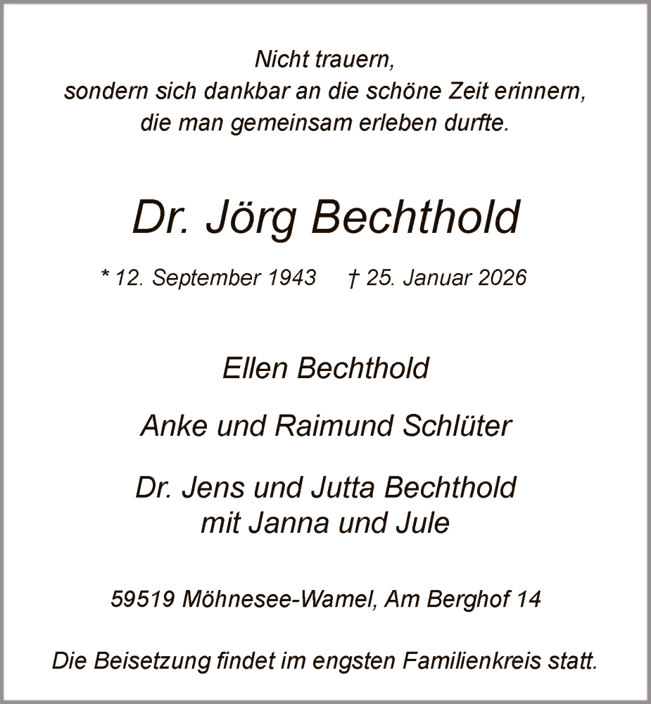 Hier finden Sie alle Traueranzeigen aus der Zeitung, die bisher für Jörg Bechthold erschienen sind. Weitere Traueranzeigen, die in der Zeitung erscheinen, werden hier ebenfalls aufgelistet