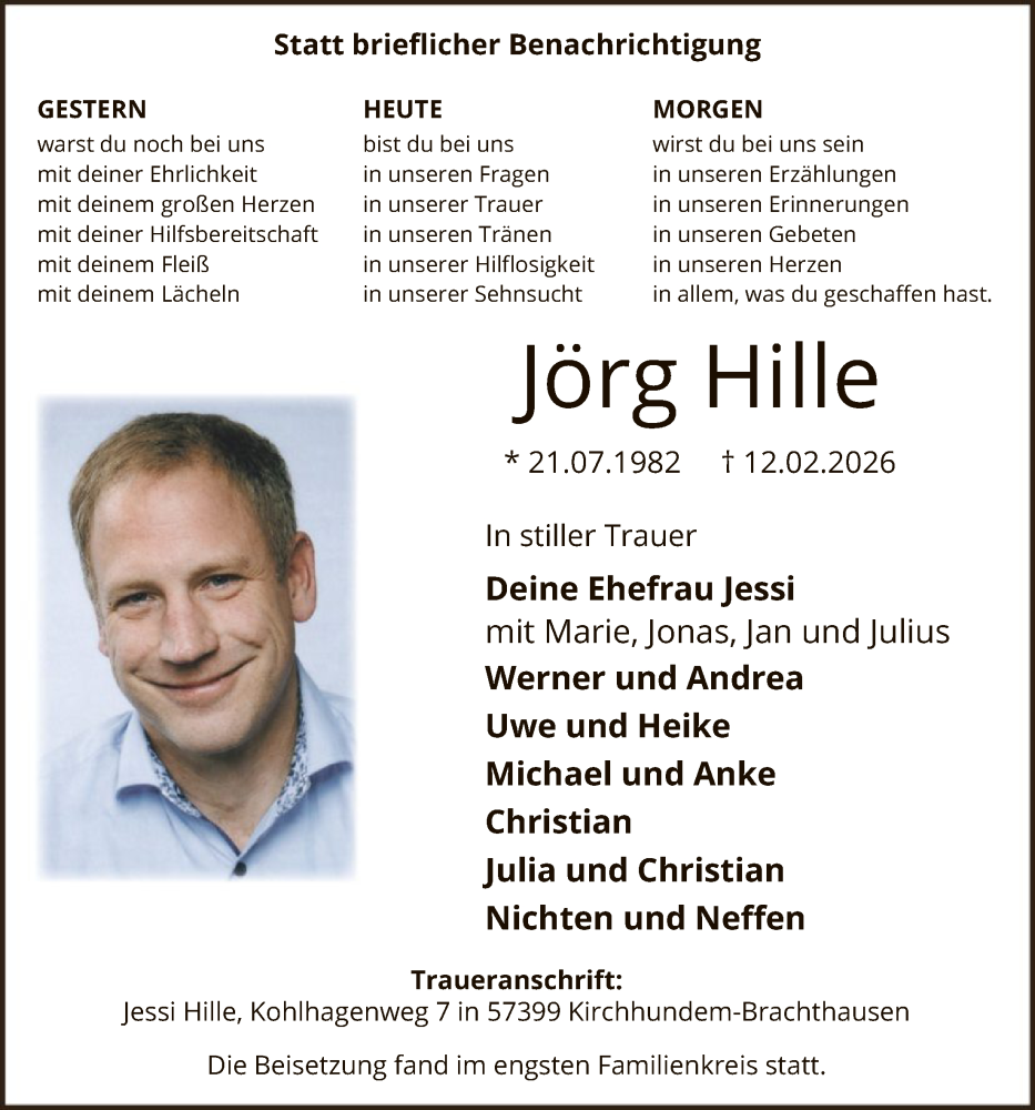 Hier finden Sie alle Traueranzeigen aus der Zeitung, die bisher für Jörg Hille erschienen sind. Weitere Traueranzeigen, die in der Zeitung erscheinen, werden hier ebenfalls aufgelistet