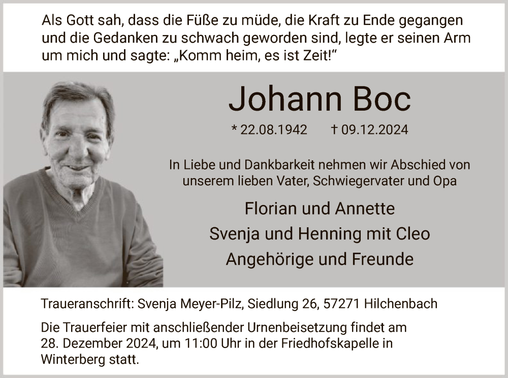 Hier finden Sie alle Traueranzeigen aus der Zeitung, die bisher für Johann Boc erschienen sind. Weitere Traueranzeigen, die in der Zeitung erscheinen, werden hier ebenfalls aufgelistet