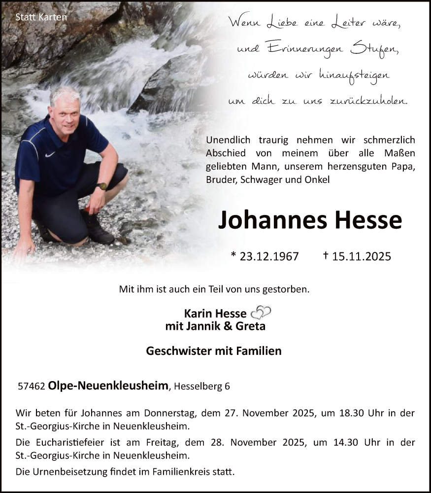 Hier finden Sie alle Traueranzeigen aus der Zeitung, die bisher für Johannes Hesse erschienen sind. Weitere Traueranzeigen, die in der Zeitung erscheinen, werden hier ebenfalls aufgelistet