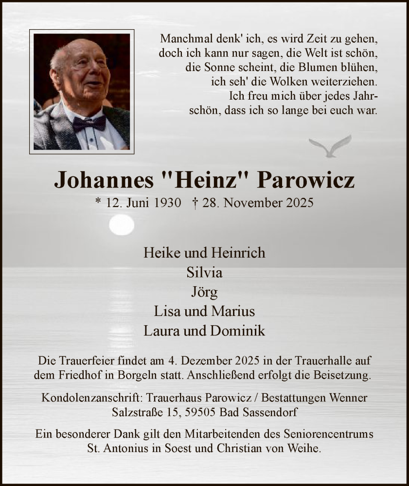 Hier finden Sie alle Traueranzeigen aus der Zeitung, die bisher für Johannes Parowicz erschienen sind. Weitere Traueranzeigen, die in der Zeitung erscheinen, werden hier ebenfalls aufgelistet