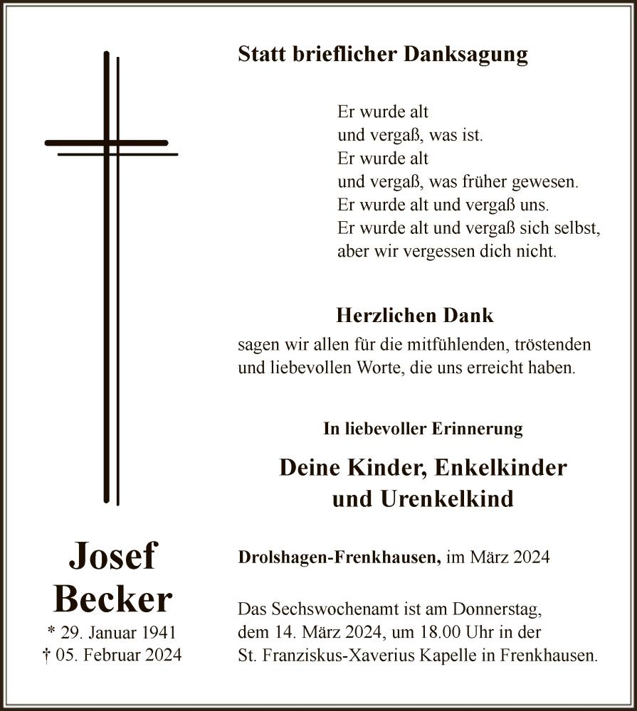Hier finden Sie alle Traueranzeigen aus der Zeitung, die bisher für Josef Becker erschienen sind. Weitere Traueranzeigen, die in der Zeitung erscheinen, werden hier ebenfalls aufgelistet