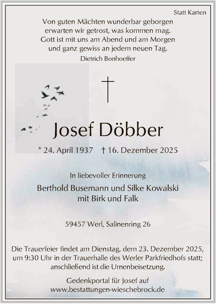 Hier finden Sie alle Traueranzeigen aus der Zeitung, die bisher für Josef Döbber erschienen sind. Weitere Traueranzeigen, die in der Zeitung erscheinen, werden hier ebenfalls aufgelistet