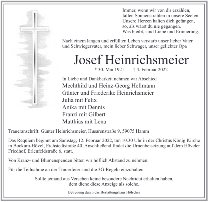 Hier finden Sie alle Traueranzeigen aus der Zeitung, die bisher für Josef Heinrichsmeier erschienen sind. Weitere Traueranzeigen, die in der Zeitung erscheinen, werden hier ebenfalls aufgelistet