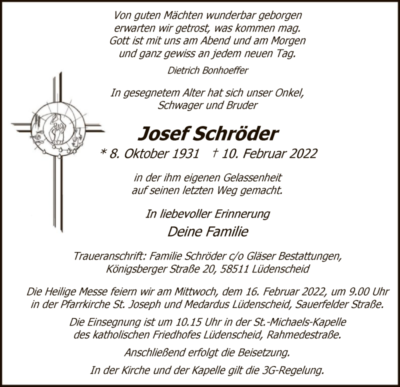 Hier finden Sie alle Traueranzeigen aus der Zeitung, die bisher für Josef Schröder erschienen sind. Weitere Traueranzeigen, die in der Zeitung erscheinen, werden hier ebenfalls aufgelistet