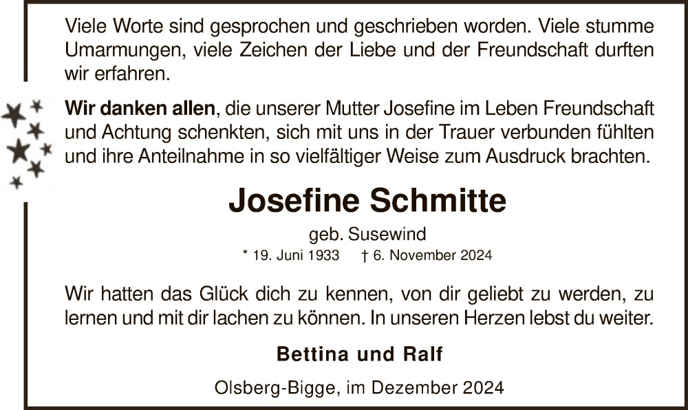 Hier finden Sie alle Traueranzeigen aus der Zeitung, die bisher für Josefine Schmitte erschienen sind. Weitere Traueranzeigen, die in der Zeitung erscheinen, werden hier ebenfalls aufgelistet