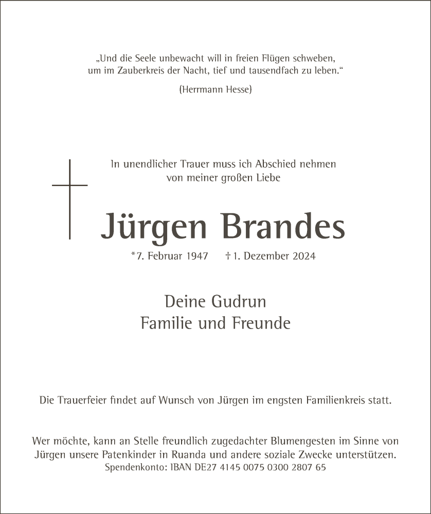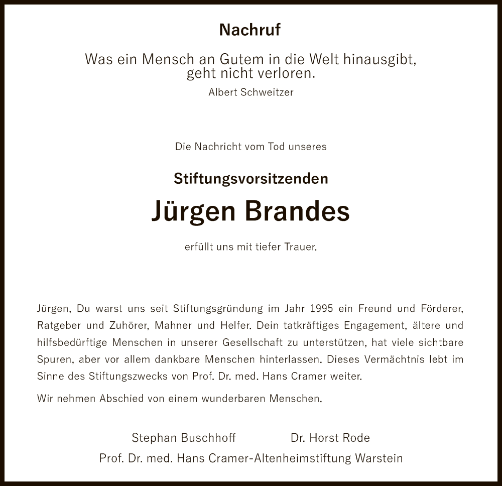 Hier finden Sie alle Traueranzeigen aus der Zeitung, die bisher für Jürgen Brandes erschienen sind. Weitere Traueranzeigen, die in der Zeitung erscheinen, werden hier ebenfalls aufgelistet