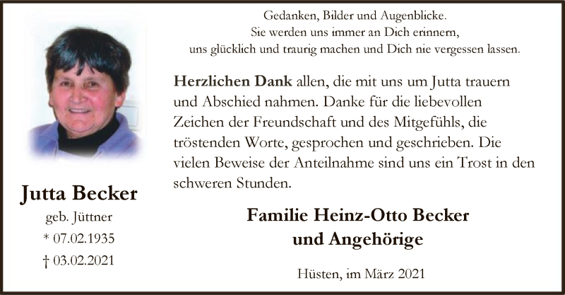 Hier finden Sie alle Traueranzeigen aus der Zeitung, die bisher für Jutta Becker erschienen sind. Weitere Traueranzeigen, die in der Zeitung erscheinen, werden hier ebenfalls aufgelistet