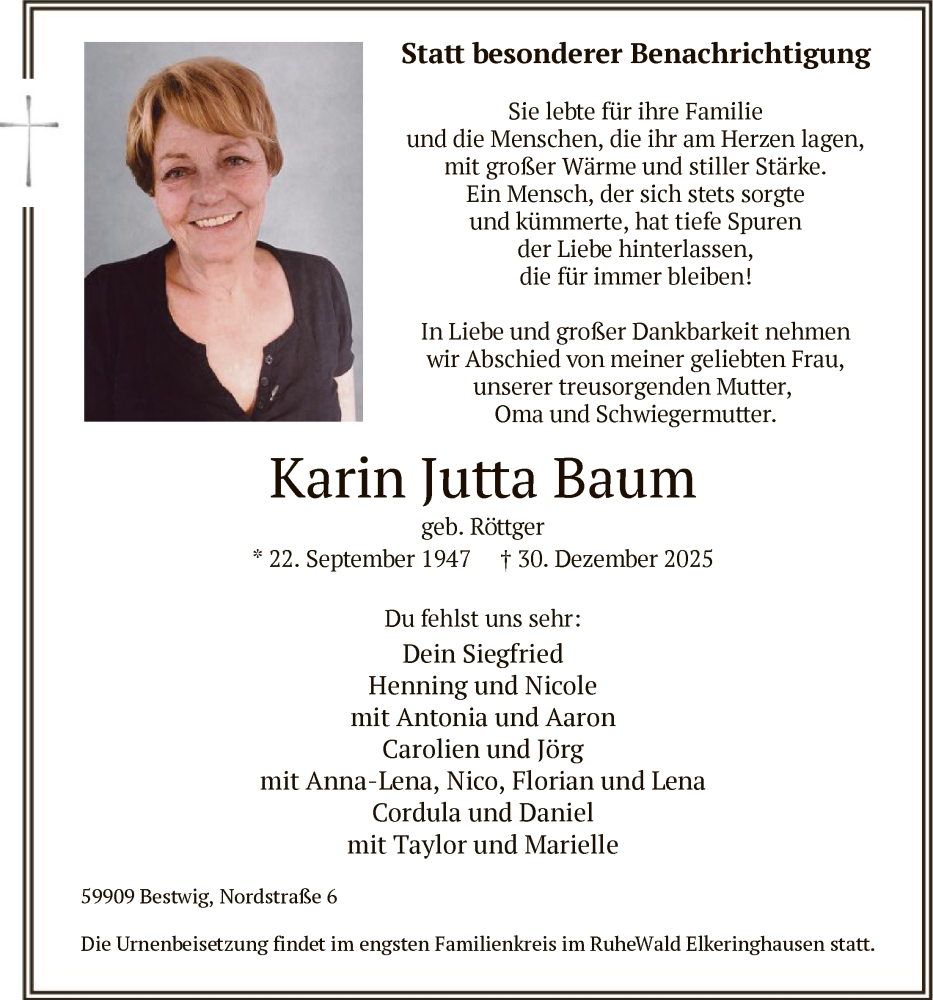 Hier finden Sie alle Traueranzeigen aus der Zeitung, die bisher für Karin Jutta Baum erschienen sind. Weitere Traueranzeigen, die in der Zeitung erscheinen, werden hier ebenfalls aufgelistet