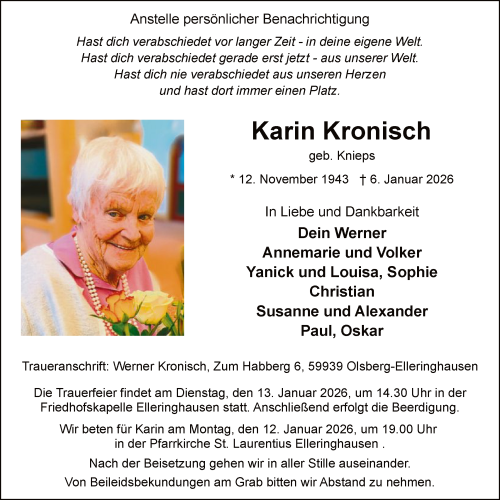 Hier finden Sie alle Traueranzeigen aus der Zeitung, die bisher für Karin Kronisch erschienen sind. Weitere Traueranzeigen, die in der Zeitung erscheinen, werden hier ebenfalls aufgelistet
