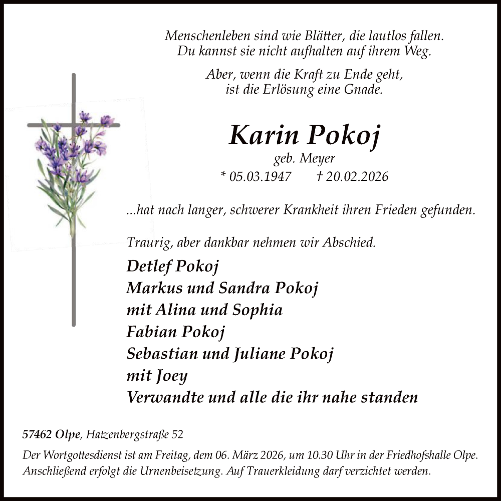 Hier finden Sie alle Traueranzeigen aus der Zeitung, die bisher für Karin Pokoj erschienen sind. Weitere Traueranzeigen, die in der Zeitung erscheinen, werden hier ebenfalls aufgelistet