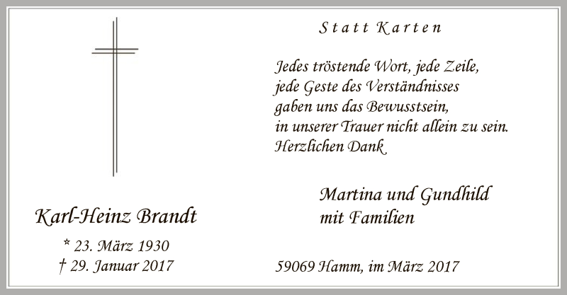Hier finden Sie alle Traueranzeigen aus der Zeitung, die bisher für Karl-Heinz Brandt erschienen sind. Weitere Traueranzeigen, die in der Zeitung erscheinen, werden hier ebenfalls aufgelistet