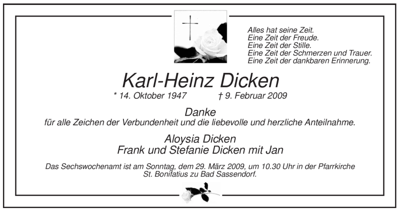 Hier finden Sie alle Traueranzeigen aus der Zeitung, die bisher für Karl-Heinz Dicken erschienen sind. Weitere Traueranzeigen, die in der Zeitung erscheinen, werden hier ebenfalls aufgelistet