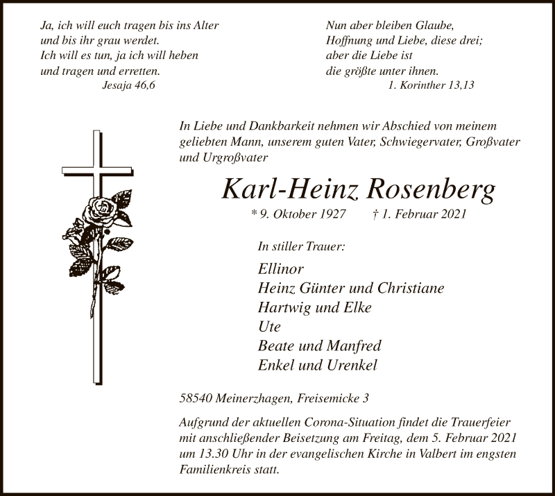 Hier finden Sie alle Traueranzeigen aus der Zeitung, die bisher für Karl-Heinz Rosenberg erschienen sind. Weitere Traueranzeigen, die in der Zeitung erscheinen, werden hier ebenfalls aufgelistet