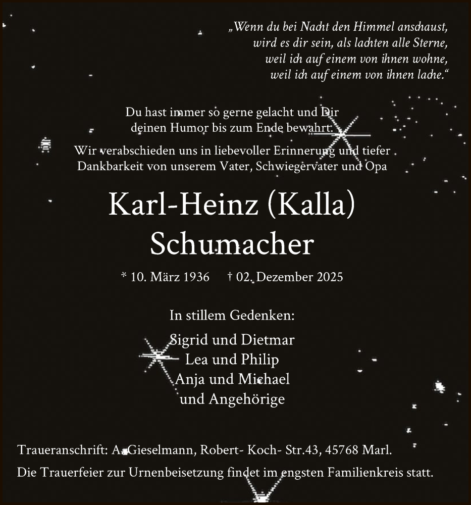 Hier finden Sie alle Traueranzeigen aus der Zeitung, die bisher für Karl-Heinz Schumacher erschienen sind. Weitere Traueranzeigen, die in der Zeitung erscheinen, werden hier ebenfalls aufgelistet