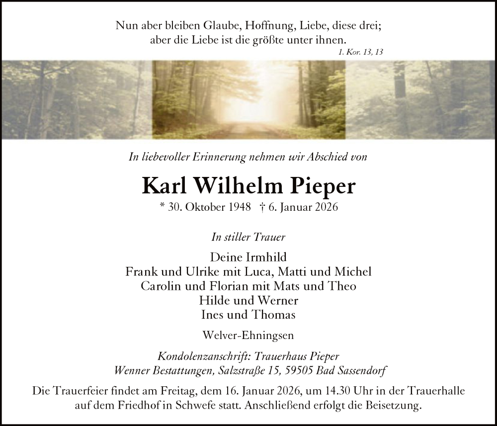 Hier finden Sie alle Traueranzeigen aus der Zeitung, die bisher für Karl Wilhelm Pieper erschienen sind. Weitere Traueranzeigen, die in der Zeitung erscheinen, werden hier ebenfalls aufgelistet