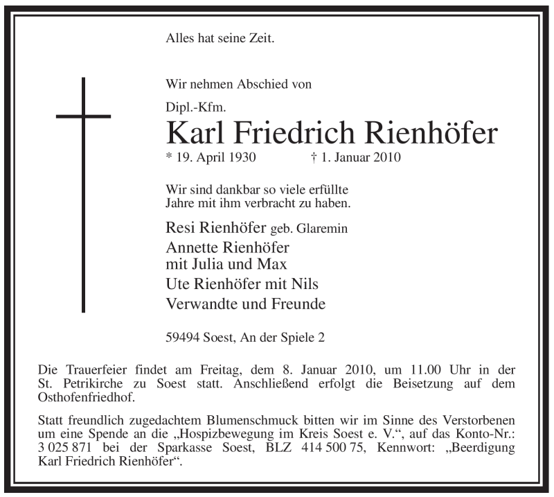 Hier finden Sie alle Traueranzeigen aus der Zeitung, die bisher für Karl Friedrich Rienhöfer erschienen sind. Weitere Traueranzeigen, die in der Zeitung erscheinen, werden hier ebenfalls aufgelistet