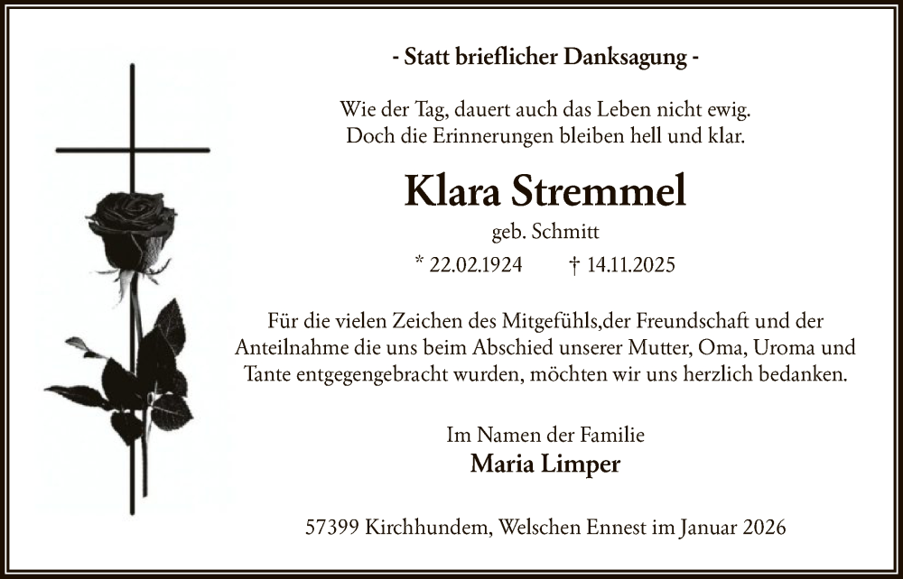 Hier finden Sie alle Traueranzeigen aus der Zeitung, die bisher für Klara Stremmel erschienen sind. Weitere Traueranzeigen, die in der Zeitung erscheinen, werden hier ebenfalls aufgelistet