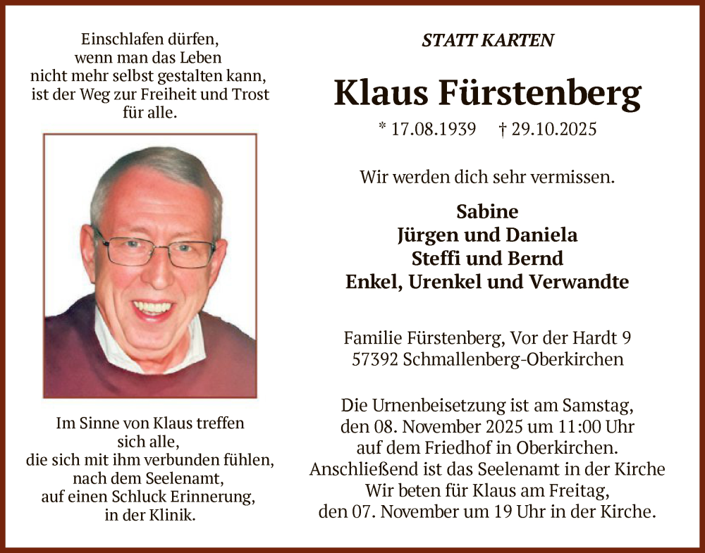 Hier finden Sie alle Traueranzeigen aus der Zeitung, die bisher für Klaus Fürstenberg erschienen sind. Weitere Traueranzeigen, die in der Zeitung erscheinen, werden hier ebenfalls aufgelistet