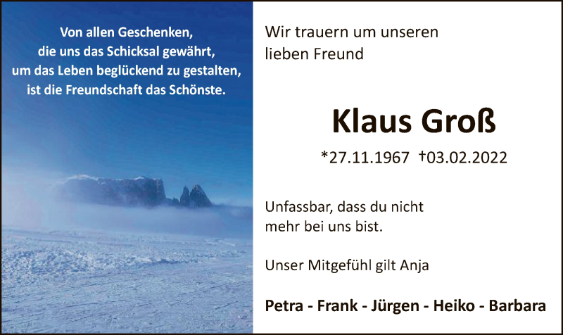 Hier finden Sie alle Traueranzeigen aus der Zeitung, die bisher für Klaus Groß erschienen sind. Weitere Traueranzeigen, die in der Zeitung erscheinen, werden hier ebenfalls aufgelistet