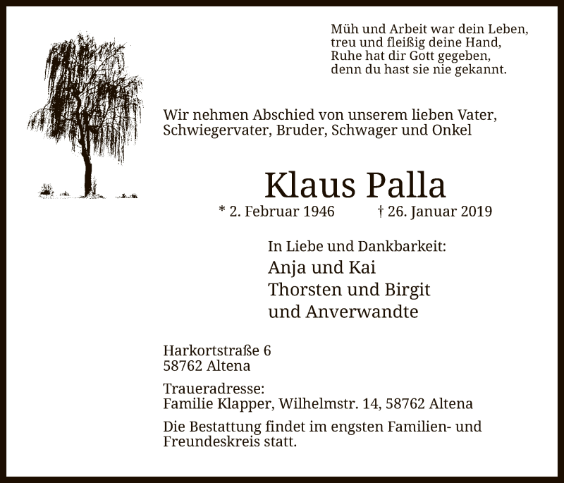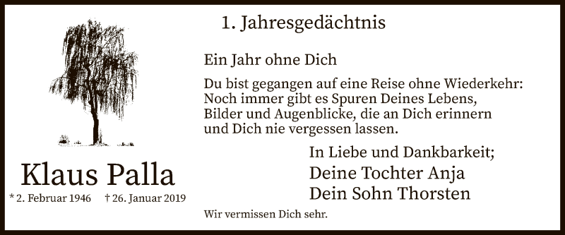 Hier finden Sie alle Traueranzeigen aus der Zeitung, die bisher für Klaus Palla erschienen sind. Weitere Traueranzeigen, die in der Zeitung erscheinen, werden hier ebenfalls aufgelistet