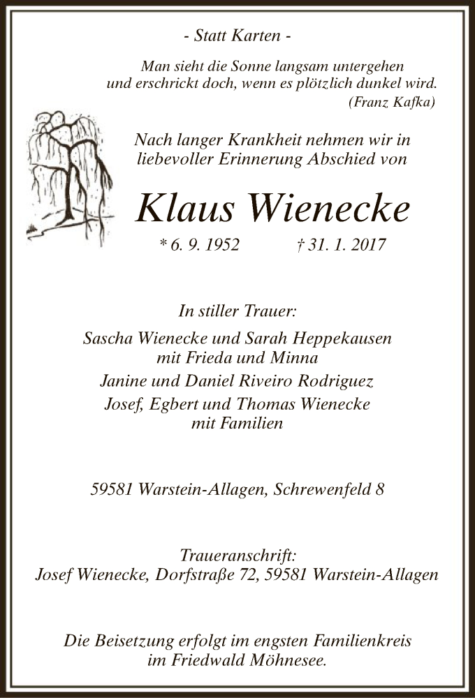 Hier finden Sie alle Traueranzeigen aus der Zeitung, die bisher für Klaus Wienecke erschienen sind. Weitere Traueranzeigen, die in der Zeitung erscheinen, werden hier ebenfalls aufgelistet