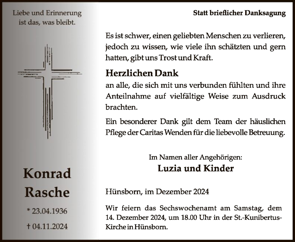Hier finden Sie alle Traueranzeigen aus der Zeitung, die bisher für Konrad Rasche erschienen sind. Weitere Traueranzeigen, die in der Zeitung erscheinen, werden hier ebenfalls aufgelistet