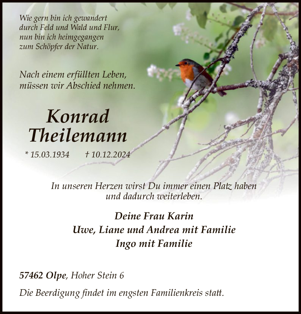 Hier finden Sie alle Traueranzeigen aus der Zeitung, die bisher für Konrad Theilemann erschienen sind. Weitere Traueranzeigen, die in der Zeitung erscheinen, werden hier ebenfalls aufgelistet