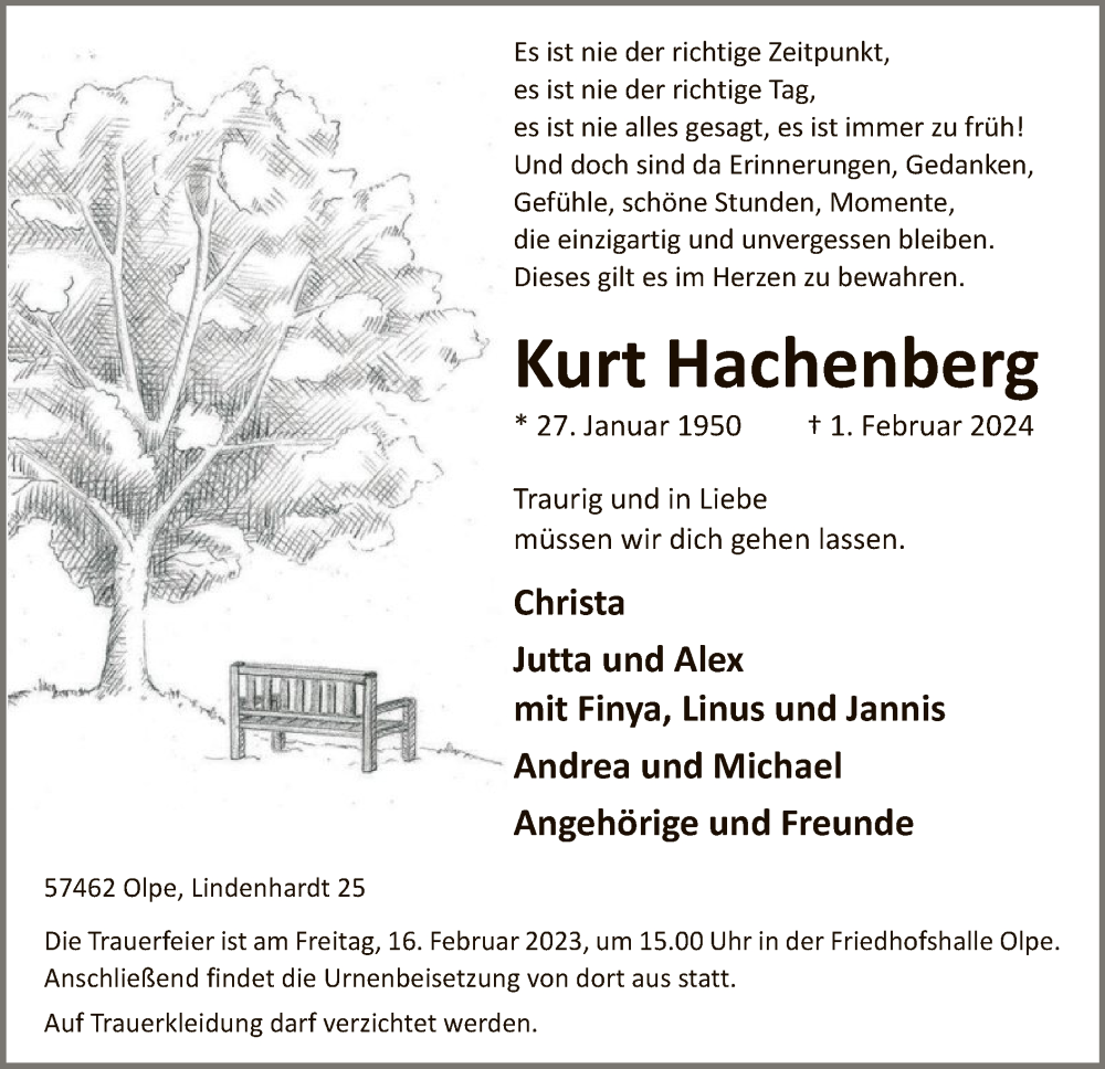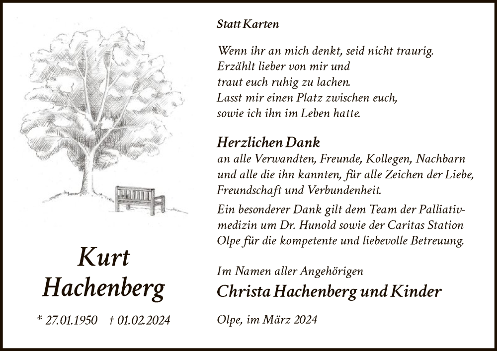 Hier finden Sie alle Traueranzeigen aus der Zeitung, die bisher für Kurt Hachenberg erschienen sind. Weitere Traueranzeigen, die in der Zeitung erscheinen, werden hier ebenfalls aufgelistet