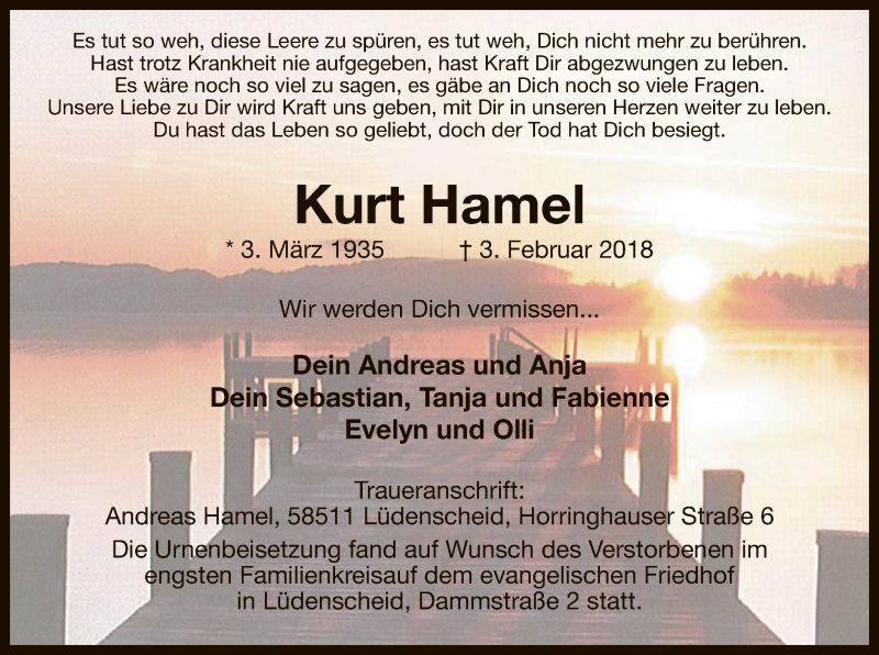 Hier finden Sie alle Traueranzeigen aus der Zeitung, die bisher für Kurt Hamel erschienen sind. Weitere Traueranzeigen, die in der Zeitung erscheinen, werden hier ebenfalls aufgelistet