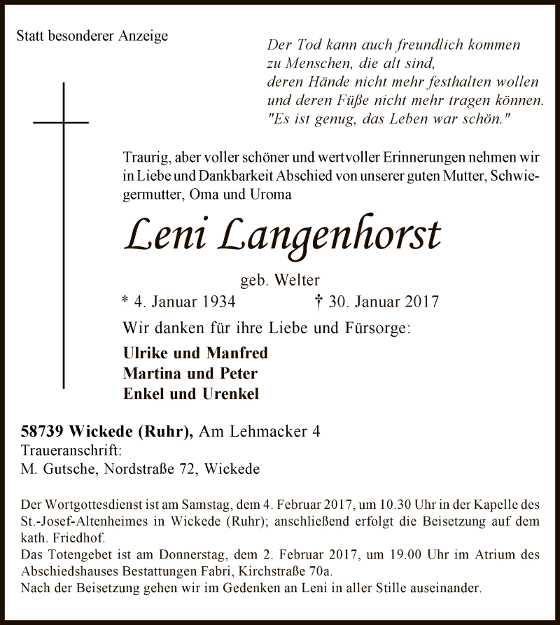 Hier finden Sie alle Traueranzeigen aus der Zeitung, die bisher für Leni Langenhorst erschienen sind. Weitere Traueranzeigen, die in der Zeitung erscheinen, werden hier ebenfalls aufgelistet