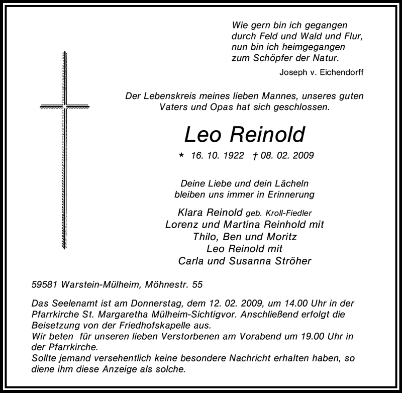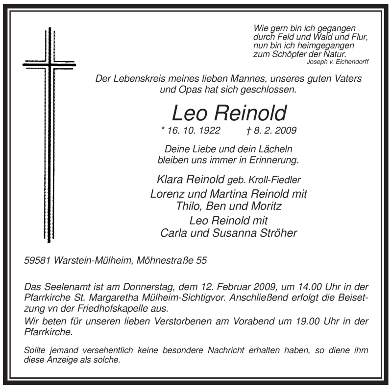 Hier finden Sie alle Traueranzeigen aus der Zeitung, die bisher für Leo Reinold erschienen sind. Weitere Traueranzeigen, die in der Zeitung erscheinen, werden hier ebenfalls aufgelistet